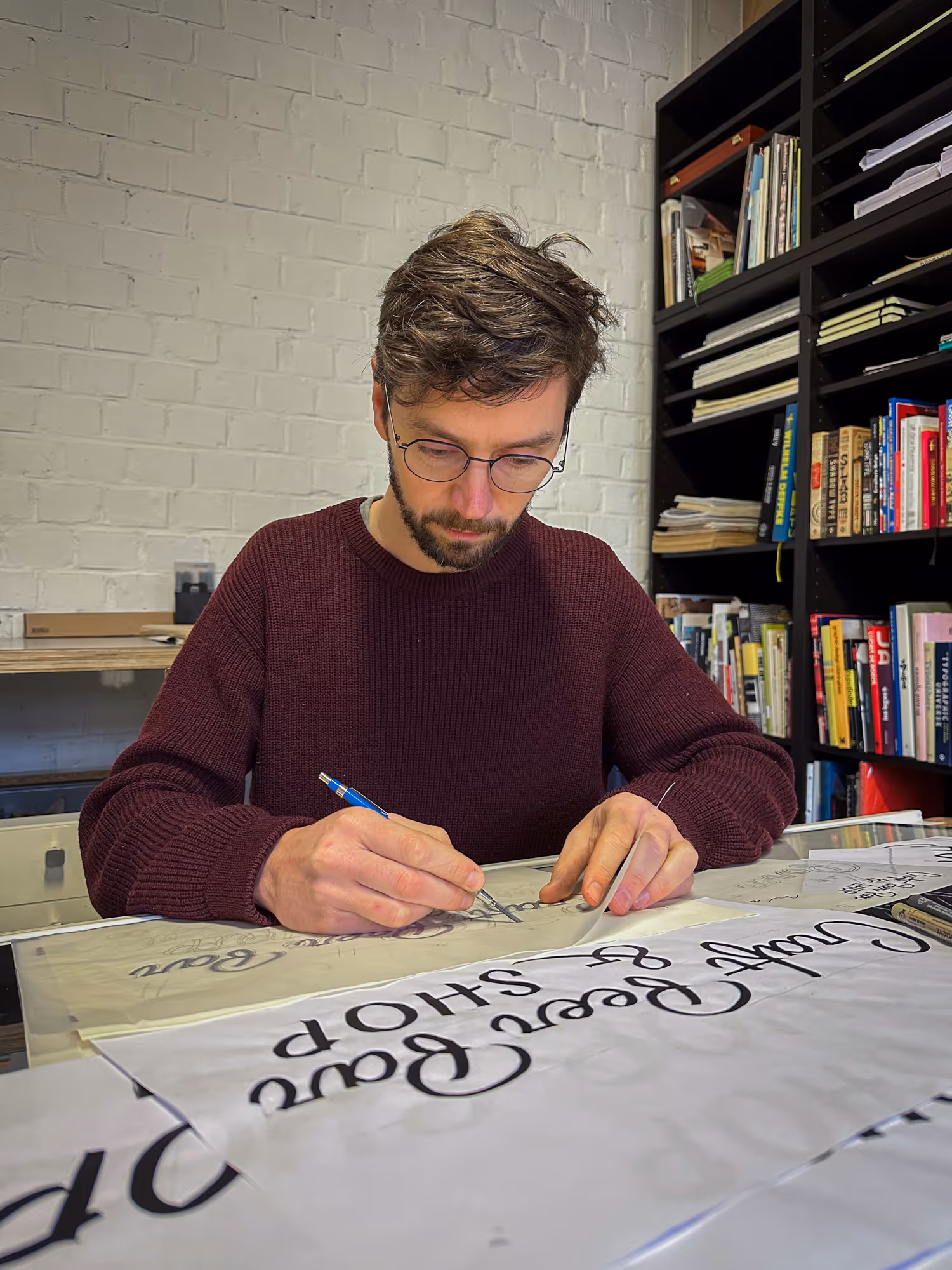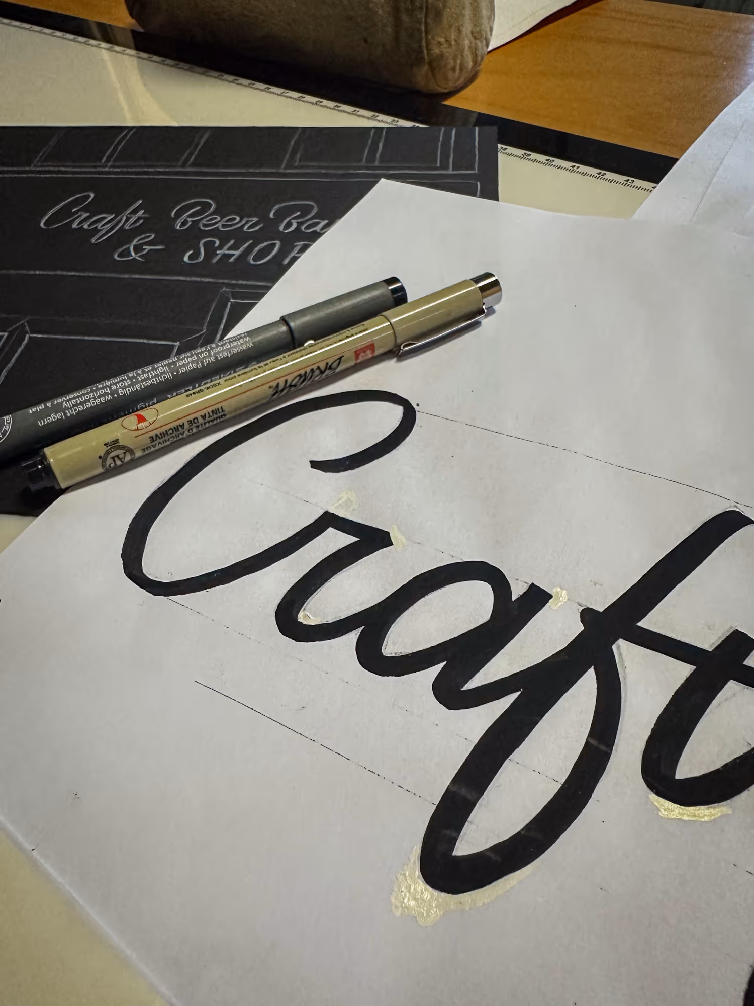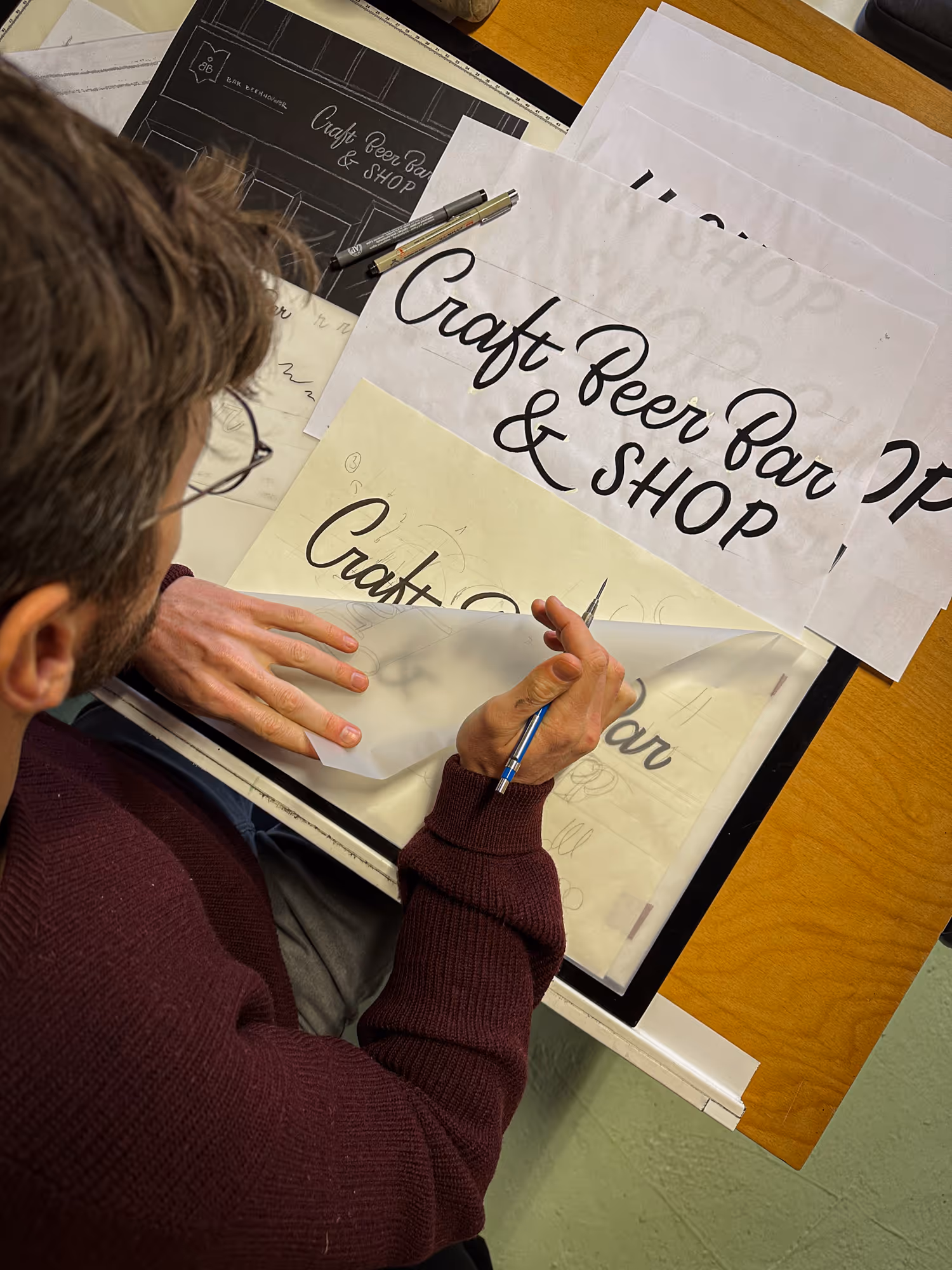 De naam van de bar prijkt al sinds de oprichting in 2019 boven de ingang maar vroeg om verduidelijking. Met pen en papier ben ik aan de slag gegaan voor het ontwerp van speelse, levendige belettering, alsof het losjes uit de pols op de gevel is gekrabbeld. Uiteraard gaat hier wat voorbereiding aan vooraf, met hier en daar wat correcties in tip-ex.