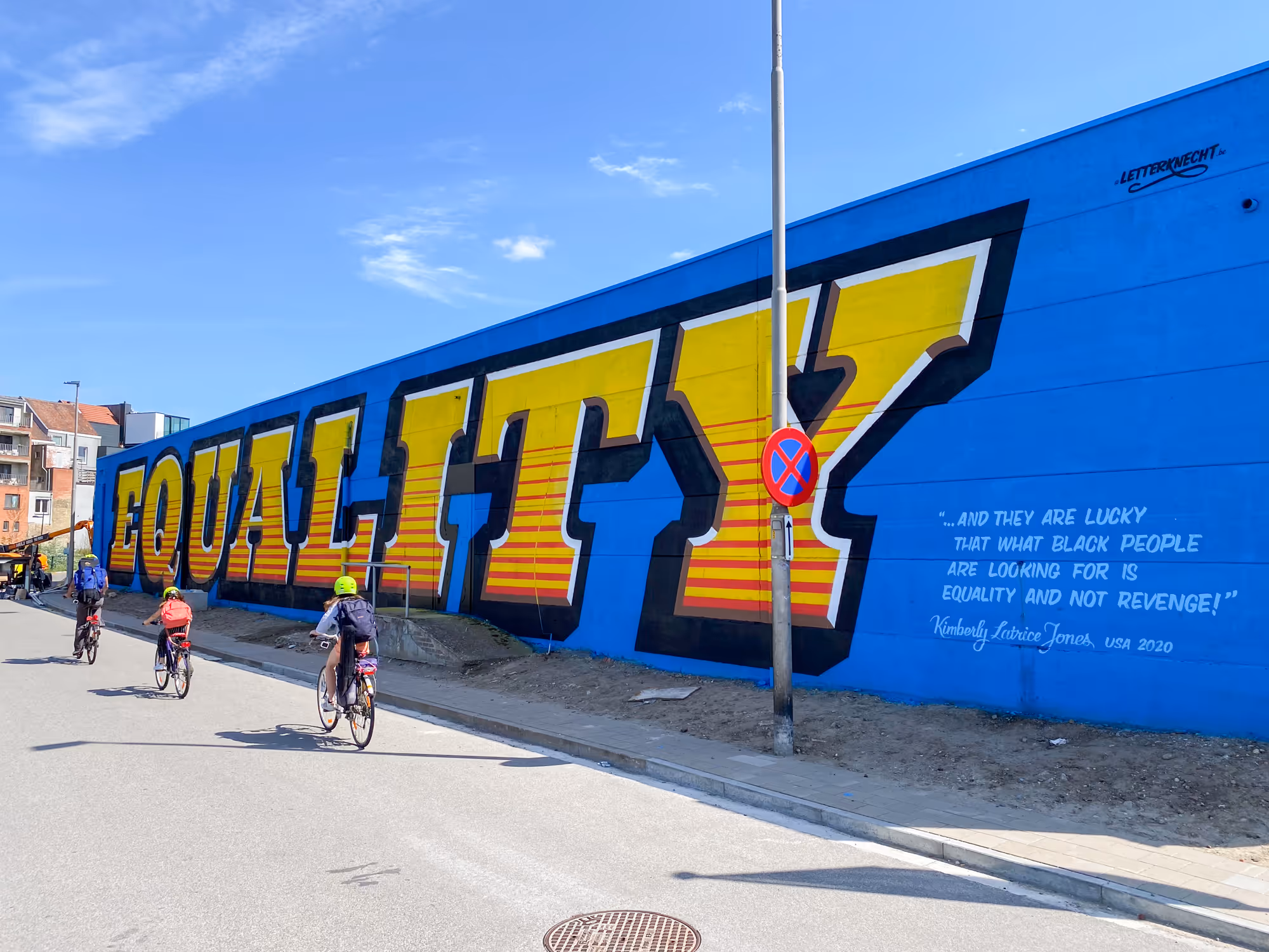 Vanaf het begin wist ik dat deze muur na een paar maanden zou worden afgebroken, maar ik kon de kans niet laten schieten. Ik moest dit schilderen. "Equality", 44 meter lang en 5 meter hoog, stond als een visuele roep om rechtvaardigheid op de achtergevel van de supermarkt langs de Franse Vaart in Ledeberg, Gent. Vijf dagen lang werkten ik met de hulp van enkele vrienden onvermoeibaar om deze boodschap te schilderen.