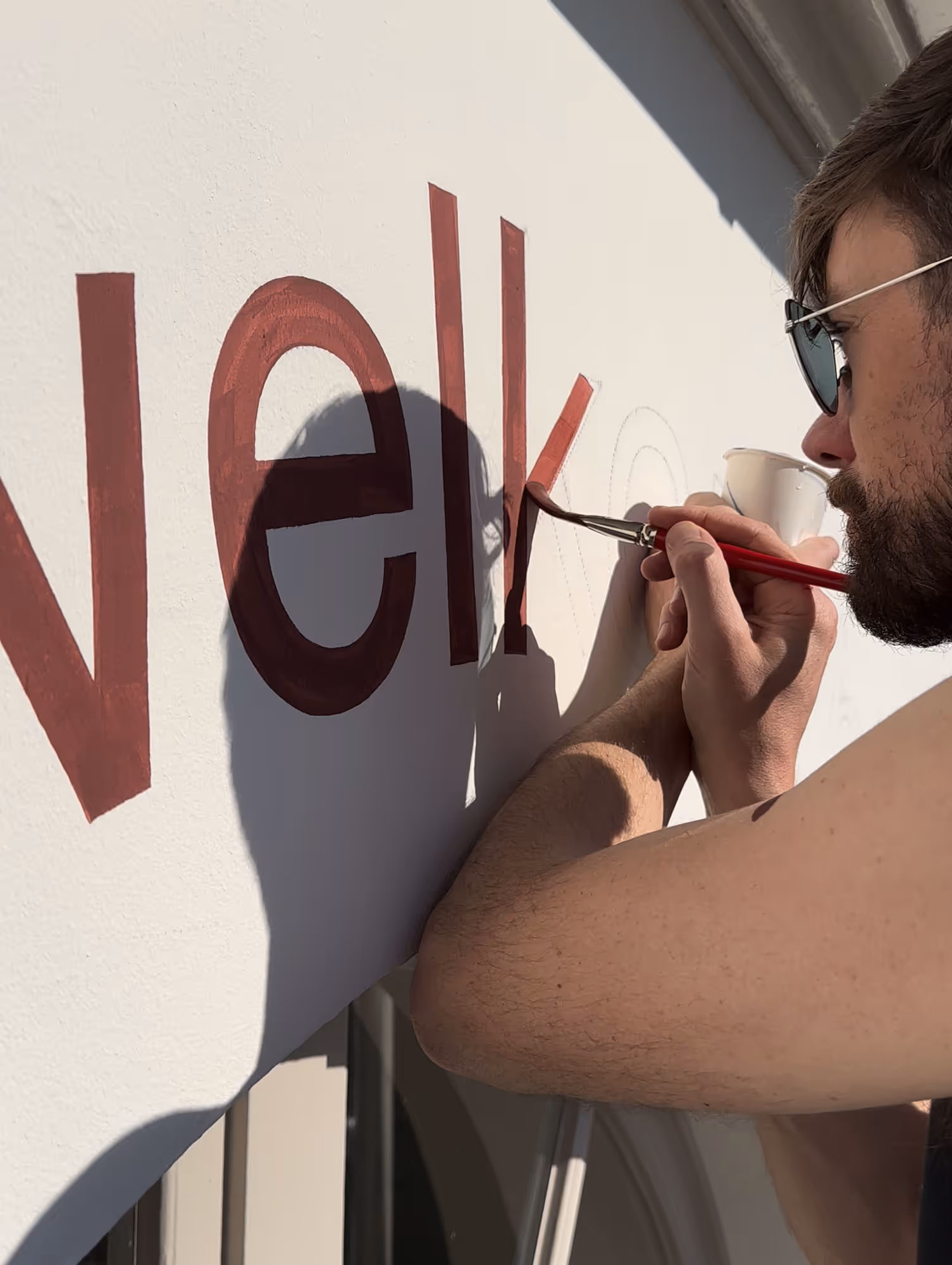 De ingang van het bezoekerspaviljoen van het Middelheimmuseum is vanaf heden makkelijker te vinden dankzij het ontwerp van Mirror Mirror. 'Welkom' werd in drie talen geschilderd in drie huisstijlkleuren. De zuidgerichte muur vangt veel zon, daarom gaf ik elke letter drie lagen verf.
